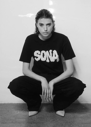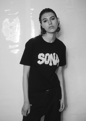 Black women t-shirt with print on the chest and round neck. Made from heavy, soft cotton with a classic fit. The sizes correspond to regular standard measurements – if you normally wear size L, you should also choose L here.