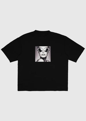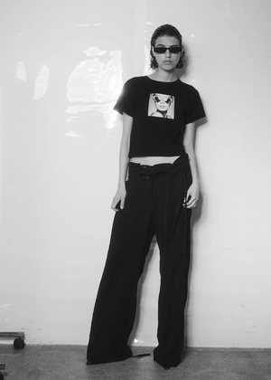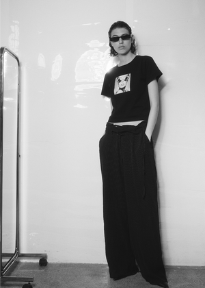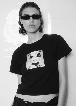 Black cropped t-shirt with print on the chest and round neck. Made from heavy, soft cotton with a classic fit. The t-shirt has a cropped look, but the sizes correspond to regular standard measurements – if you normally wear size L, you should also choose L here.
